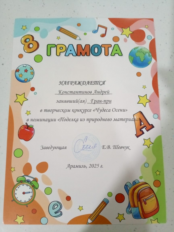 Смотр-конкурс чтецов среди воспитанников МАДОУ № 4 «Солнышко» «Разукрасим мир стихами» РАННИЙ ВОЗРАСТ: - 2 место Карапетян Агаси; - 1 место Марчуков Артём. МЛАДШИЙ ВОЗРАСТ: - 3 место Бабушкин Лев; - 2 место Адамова Мирослава; - 1 место Маргарян Мари. СРЕДНИЙ ВОЗРАСТ: - 3 место Куприна София; - 2 место Томилов Дмитрий; - 1 место Балтачева София. СТАРШИЙ ВОЗРАСТ: - 3 место Мурашов Алексей, Дроздова Таисия; - 2 место Борисова Ева; - 1 место Черных Артём. Объявляем результаты творческого конкурсы «Чудеса осени». По результатам оценки жюри. Номинация «Осенний вернисаж»: - 3 место Багринцева София «Осенняя кошка»; - 2 место Гаврилко Илларион «Концерт на болоте»; - 1 место Устюгов Артемий «Дюймовочка в осеннем лесу». Номинация «Осенний букет»: - 3 место Чухарева Василина «Осенний букет»; - 2 место Курбангалиев Эмиль «Букет для осени»; - 1 место Кайсарова Виктория. Номинация «Поделка из природного материала» - 3 место Логунов Ленар «Домик на опушке», Емельянов Роман «Совиная почта»; - 2 место Домрачев Иван «Сказачная опушка»; - 1 место Кайсаров Максимилиан «Я на солнышке лежу». Номинация «Чудо природы» - 2 место Буруков Михаил «Чудо тыква»; - 1 место Иртуганова Полина «Кукуруза на отдыхе» Гран При Константинов Андрей «Лошадка». Номинация «Приз зрительских симпатий» Чухарева Василина «Осенний букет» - 461 голос. Муниципальная спортивна-развлекательная игра "Весёлые старты", среди воспитанников дошкольных образовательных учреждений АГО 3 место команда "СОЛНЫШКО" детского сада № 4.