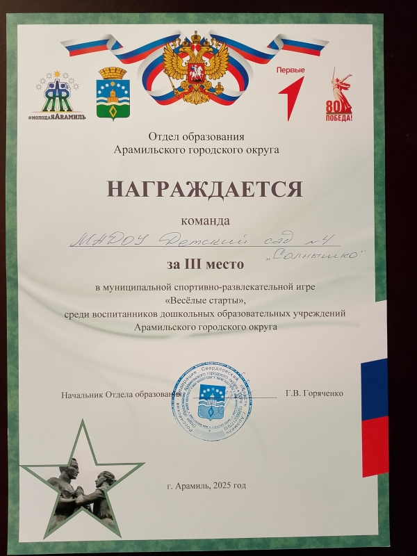 Смотр-конкурс чтецов среди воспитанников МАДОУ № 4 «Солнышко» «Разукрасим мир стихами» РАННИЙ ВОЗРАСТ: - 2 место Карапетян Агаси; - 1 место Марчуков Артём. МЛАДШИЙ ВОЗРАСТ: - 3 место Бабушкин Лев; - 2 место Адамова Мирослава; - 1 место Маргарян Мари. СРЕДНИЙ ВОЗРАСТ: - 3 место Куприна София; - 2 место Томилов Дмитрий; - 1 место Балтачева София. СТАРШИЙ ВОЗРАСТ: - 3 место Мурашов Алексей, Дроздова Таисия; - 2 место Борисова Ева; - 1 место Черных Артём. Объявляем результаты творческого конкурсы «Чудеса осени». По результатам оценки жюри. Номинация «Осенний вернисаж»: - 3 место Багринцева София «Осенняя кошка»; - 2 место Гаврилко Илларион «Концерт на болоте»; - 1 место Устюгов Артемий «Дюймовочка в осеннем лесу». Номинация «Осенний букет»: - 3 место Чухарева Василина «Осенний букет»; - 2 место Курбангалиев Эмиль «Букет для осени»; - 1 место Кайсарова Виктория. Номинация «Поделка из природного материала» - 3 место Логунов Ленар «Домик на опушке», Емельянов Роман «Совиная почта»; - 2 место Домрачев Иван «Сказачная опушка»; - 1 место Кайсаров Максимилиан «Я на солнышке лежу». Номинация «Чудо природы» - 2 место Буруков Михаил «Чудо тыква»; - 1 место Иртуганова Полина «Кукуруза на отдыхе» Гран При Константинов Андрей «Лошадка». Номинация «Приз зрительских симпатий» Чухарева Василина «Осенний букет» - 461 голос. Муниципальная спортивна-развлекательная игра "Весёлые старты", среди воспитанников дошкольных образовательных учреждений АГО 3 место команда "СОЛНЫШКО" детского сада № 4.
